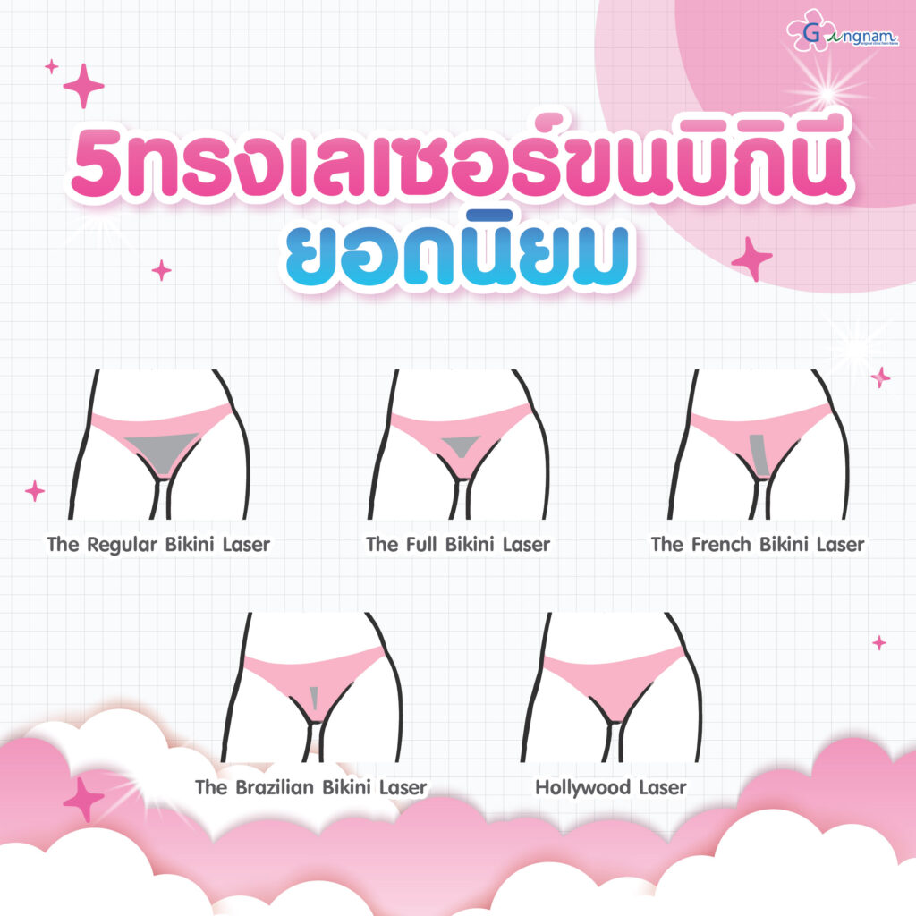 การทำเลเซอร์ขนบิกินี่มี 5 แบบ โดยจะขึ้นอยู่กับความชอบและความต้องการของแต่ละคน ได้แก่
