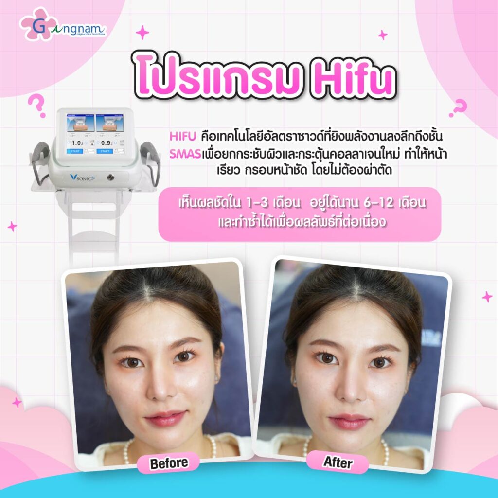 HIFU หรือ High Intensity Focused Ultrasound เป็นหัตถการที่ใช้เทคโนโลยีคลื่นเสียงอัลตราซาวด์ที่มีความเข้มข้นสูง ยิงเข้าไปบริเวณใต้ชั้นผิว SMAS ซึ่งเป็นชั้นเนื้อเยื่อพยุงผิว ทำให้ผิวชั้นนั้นหดตัวและกระตุ้นให้ร่างกายสร้างคอลลาเจนใหม่ขึ้นมาในระยะยาว ส่งผลให้ผิวหน้าที่ดูหย่อนคล้อย ดูกระชับขึ้นได้ โดยเฉพาะบริเวณที่มีไขมันเยอะเช่น กรอบหน้า แก้ม เหนียง ทำให้ใบหน้าดูเรียวสวยขึ้นโดยไม่ต้องผ่าตัดให้เจ็บตัว จึงเหมาะสำหรับคนที่มีปัญหาไขมันสะสมหรือมีปัญหาผิวหย่อนคล้อย และต้องการสร้างคอลลาเจนให้ผิวดูกระชับและใบหน้าดูเรียวขึ้น