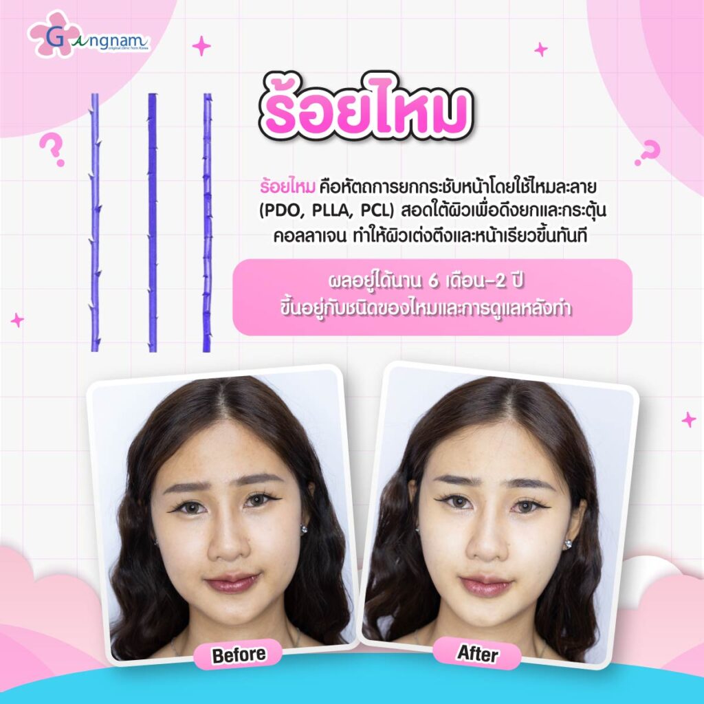 - ร้อยไหม (Thread Lift) เป็นหัตุการที่ช่วยแก้ปัญหาผิวที่มีความหย่อนคล้อยระดับปานกลางถึงมาก และผู้ที่ต้องการยกกระชับผิวให้หน้าเรียวสวยแบบเห็นผลลัพธ์อย่างชัดเจนและอยู่ได้นาน เพราะเป็นหัตถการที่ใช้ไหมร้อยเข้าไปเพื่อนยกผิวที่หย่อนคล้อยให้กระชับขึ้นและผลลัพธ์จะอยู่ได้นานกว่าหัตถการหน้าเรียวแบบไม่ต้องผ่าตัดแบบอื่น ๆ ขึ้นอยู่กับไหมที่เลือกใช้