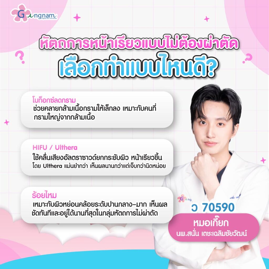 หากพูดถึงปัญหาความงามยอดฮิตที่หลายคนมีความกังวลบนใบหน้า ก็คงหนีไม่พ้นเรื่องรูปหน้าที่ไม่เรียวสวย ไม่ว่าจะเป็นปัญหา หน้าเหลี่ยม กรามใหญ่ หรือแก้มเยอะ ซึ่งเป็นปัญหาใหญ่ที่หลายคนต้องเจอ ทำให้การทำหัตถการหน้าเรียวแบบไม่ต้องผ่าตัด เช่น โบท็อกซ์ลดกราม, Hifu, Ulthera, ร้อยไหม กลายเป็นตัวเลือกอันดับต้น ๆ ที่หลายคนให้ความสนใจ