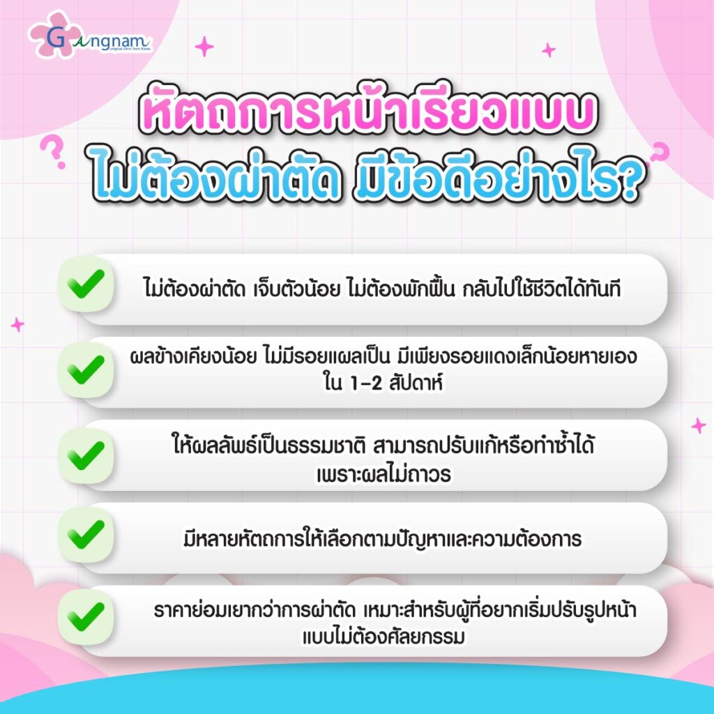 การเลือกหัตถการหน้าเรียวแบบไม่ต้องผ่าตัด นอกจากจะไม่ต้องผ่าตัดให้เจ็บตัวแล้วยังมีข้อดีอื่น ๆ อีกมากมาย ทั้งในเรื่องความปลอดภัย ความสะดวกสบายในการใช้ชีวิต และค่าใช้จ่าย ดังนี้