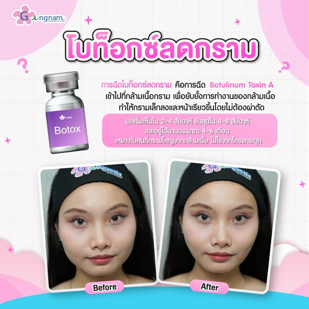 - โบท็อกซ์ลดกราม (Botox Masseter Reduction) เป็นการฉีดสาร Botulinum Toxin A เข้าไปในกล้ามเนื้อเพื่อให้ผ่อนคลายและมีขนาดเล็กลงเพียงชั่วคราว เหมาะสำหรับคนที่มีปัญหากรามใหญ่หรือมีปัญหาหน้าไม่เรียวที่เกิดจากกล้ามเนื้อบริเวณกราม