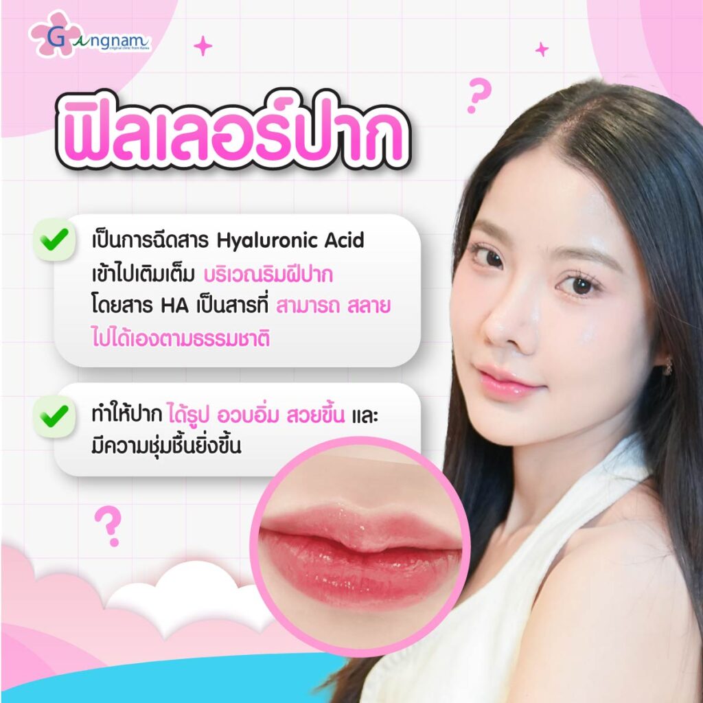 ฟิลเลอร์ปาก เป็นการฉีดสารเติมเต็ม Hyaluronic Acid เข้าไปเติมเต็มบริเวณริมฝีปาก โดยสาร HA เป็นสารที่สามารถสลายหายไปได้เองตามธรรมชาติ โดยฟิลเลอร์จะช่วยเข้าไปเติมเต็มอุ้มน้ำให้กับผิว ทำให้ปากได้รูป อวบอิ่ม สวยขึ้น และมีความชุ่มชื้นมากยิ่งขึ้น