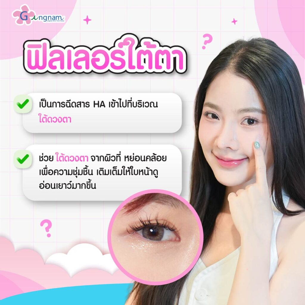ฟิลเลอร์ใต้ตา เป็นการฉีดสาร HA เข้าไปที่บริเวณใต้ดวงตา เพื่อช่วยปรับรูปตาให้กระชับจากผิวที่หย่อนคล้อย เพื่อความชุ่มชื้น เติมเต็มให้ใบหน้าดูอ่อนเยาว์มากขึ้น