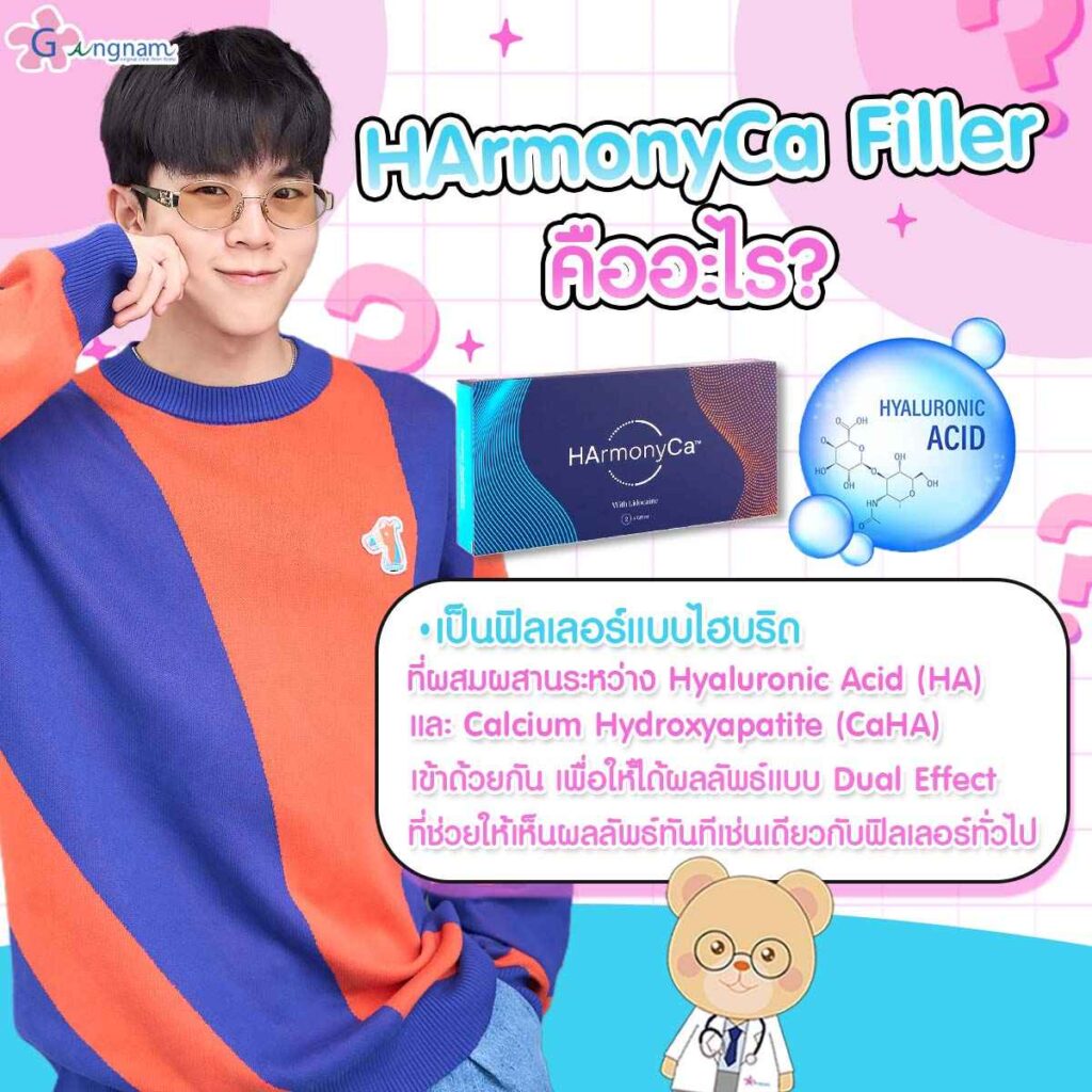 - HArmonyCa Filler เป็นนวัตกรรมใหม่ที่มีส่วนผสมหลักสองอย่างคือ Hyaluronic Acid (HA) ที่เป็นสารเติมเต็มที่ช่วยให้ผิวอิ่มฟู ชุ่มชื้น และ Calcium Hydroxyapatite (CaHA) ที่เป็นสารที่ช่วยกระตุ้นการสร้างคอลลาเจนใต้ชั้นผิว ทำให้ผิวกระชับและเห็นผลลัพธ์ได้ดีในระยะยาว ทำให้ได้ผลลัพธ์ที่ทั้งยกกระชับ และทำให้ชุ่มชื้น อิ่มฟูไปพร้อม ๆ กัน