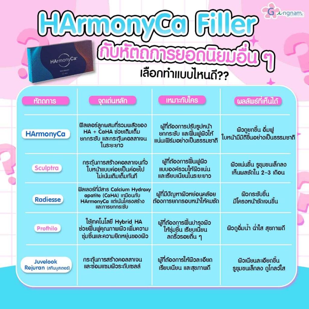 - HArmonyCa Filler เป็นฟิลเลอร์สูตรไฮบริด ที่มีส่วนผสมของ Hyaluronic Acid (HA) และ Calcium Hydroxyapatite (CaHA) ทำให้สามารถแก้ปัญหาผิวด้วยการเติมเต็มความชุ่มชื้นและยกกระชับผิวได้ทันที และช่วยกระตุ้นการสร้างคอลลาเจนให้ผิวในระยะยาว เหมาะสำหรับผู้ที่ต้องการเห็นผลลัพธ์และต้องการแก้ปัญหาผิวเฉพาะจุด