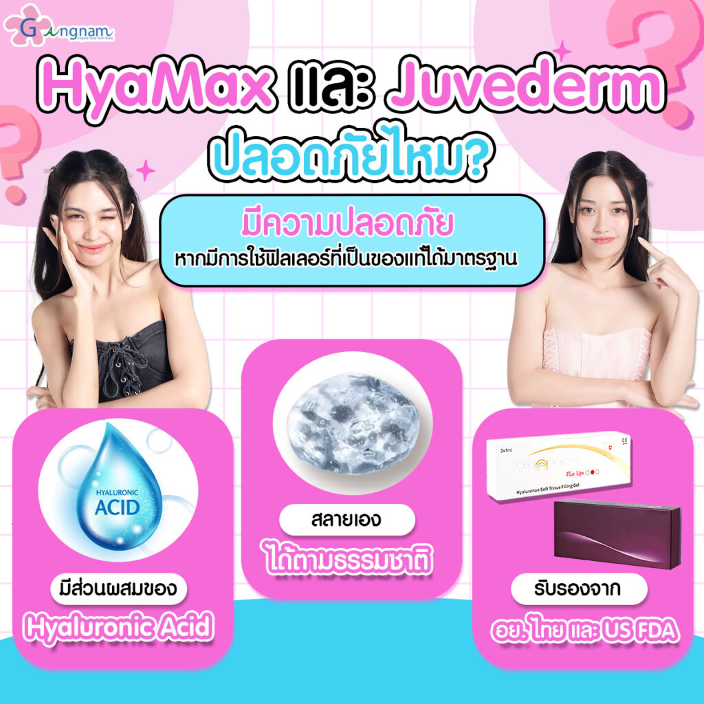 ฟิลเลอร์ HyaMax และ Juvederm มีความปลอดภัย หากมีการใช้ฟิลเลอร์ที่เป็นของแท้ได้มาตรฐาน โดยทั้งสองยี่ห้อมีส่วนผสมของ Hyaluronic Acid ที่สามารถสลายเองได้ตามธรรมชาติ อีกทั้งยังผ่านการรับรองจาก อย. ไทย และ US FDA อีกด้วย