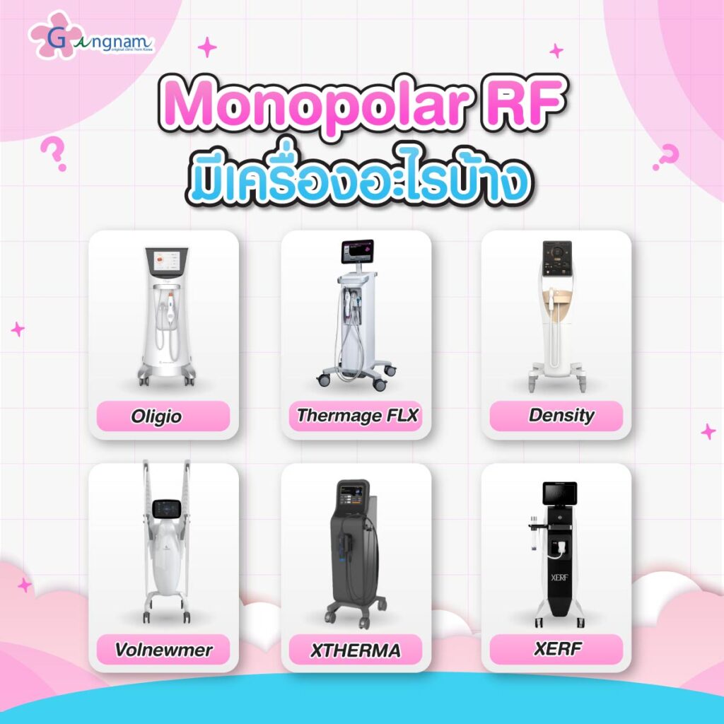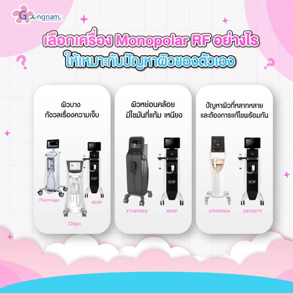 เครื่อง Monopolar RF มีหลากหลายรุ่น โดยแต่ละเครื่องนั้นมีจุดเด่นที่แตกต่างกัน ช่วยแก้ปัญหาผิวที่แตกต่างกัน ไม่ว่าจะเป็น Oligio, Thermage, Density หรือ โปรแกรม XERF โดยสิ่งที่สำคัญคือการเลือกใช้ ควรเลือกเทคโนโลยีที่เหมาะสมกับการแก้ปัญหาผิวของแต่ละบุคคล และอยู่ภายในการดูแลของแพทย์ผู้เชี่ยวชาญและมีประสบการณ์ เพื่อผลลัพธ์ที่สวยงาม มีประสิทธิภาพอย่างที่ต้องการ และที่สำคัญมีความปลอดภัย