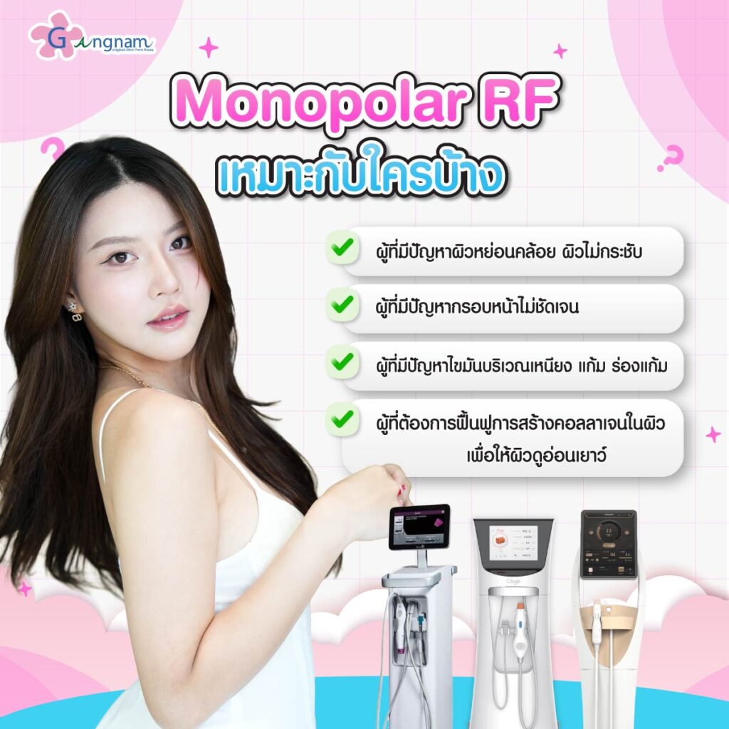Monopolar RF หรือ Monopolar Radio Frequency เป็นเทคโนโลยีที่ใช้คลื่นวิทยุความถี่สูงแบบขั้วเดียว จึงทำให้ส่งพลังงานความร้อนลงสู่ชั้นผิวหนังแท้ได้ลึกว่า RF รูปแบบอื่น ๆ ทำหน้าที่ในการช่วยกระตุ้นการสร้างคอลลาเจนและอีลาสตินใหม่ อีกทั้งยังช่วยสลายไขมันบางส่วนได้ โดย Monopolar RF ได้รับความนิยมอย่างมากในปัจจุบัน เนื่องจากเป็นเทคโนโลยีที่เห็นผลลัพธ์อย่าชัดเจน โดยไม่ต้องผ่าตัด ไม่ต้องใช้เวลาในการพักฟื้น อีกทั้งยังช่วยแก้ปัญหาผิวได้อย่างตรงจุด เช่น ผิวหย่อนคล้อย ริ้วรอย รวมถึงปัญหาไขมันสะสมบริเวณเหนียงหรือแก้มได้