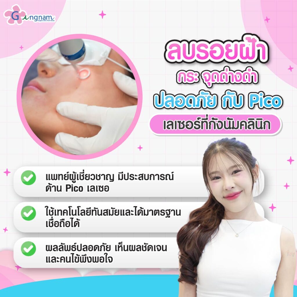 Pico Laser เทคโนโลยีเลเซอร์ที่ช่วยแก้ปัญหาผิวได้อย่างปลอดภัย แม่นยำ และมีประสิทธิภาพ สามารถช่วยแก้ปัญหา ฝ้า กระ จุดด่างดำได้จริง อีกทั้งยังสามารถช่วยฟื้นฟูผิวให้ผิวกลับมากระจ่างใส เรียบเนียน ดูอ่อนเยาว์ โดยไม่ต้องพักฟื้น หากสนใจทำ Pico Laser ที่ช่วยแก้ปัญหา ฝ้า กระ จุดด่างดำ สามารถติดต่อเพื่อขอคำปรึกษา หรือสอบถามรายละเอียดราคา โปรโมชันได้ที่ กังนัมคลินิกทุกสาขาทั่วประเทศ หรือ ทักหาออนนี่ได้ที่ Line ID :@gangnamclinic