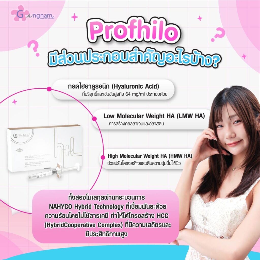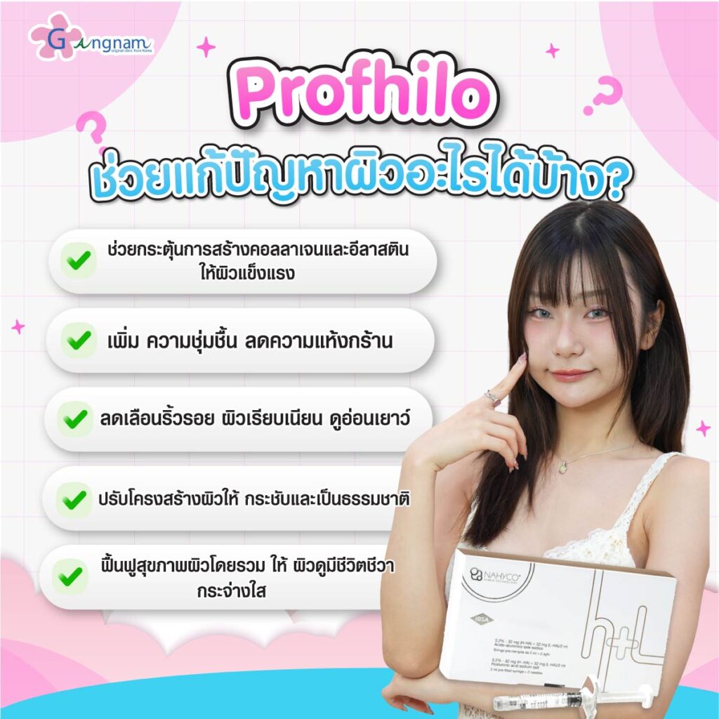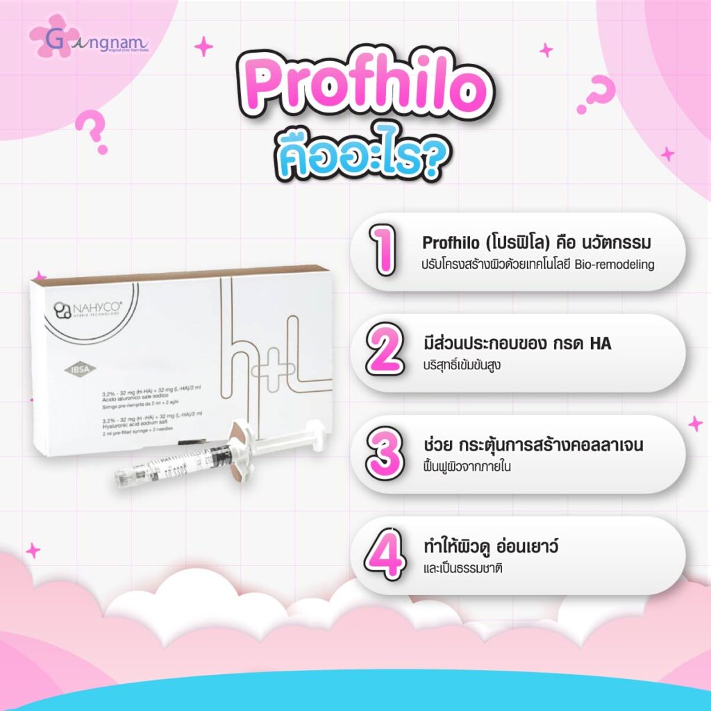 Profhilo หรือ โปรฟิโล คือ นวัตกรรมปรับโครงสร้างผิว ด้วยการผลิตโดยใช้เทคโนโลยี Bio-remodeling ช่วยให้สามารถฟื้นฟูผิวได้จากภายใน โดยมีส่วนประกอบของ กรด HA ที่บริสุทธิ์และมีความเข้มข้นสูง สามารถกระตุ้นการสร้างคอลลาเจน ทำให้ผิวดูอ่อนเยาว์อย่างเป็นธรรมชาติ