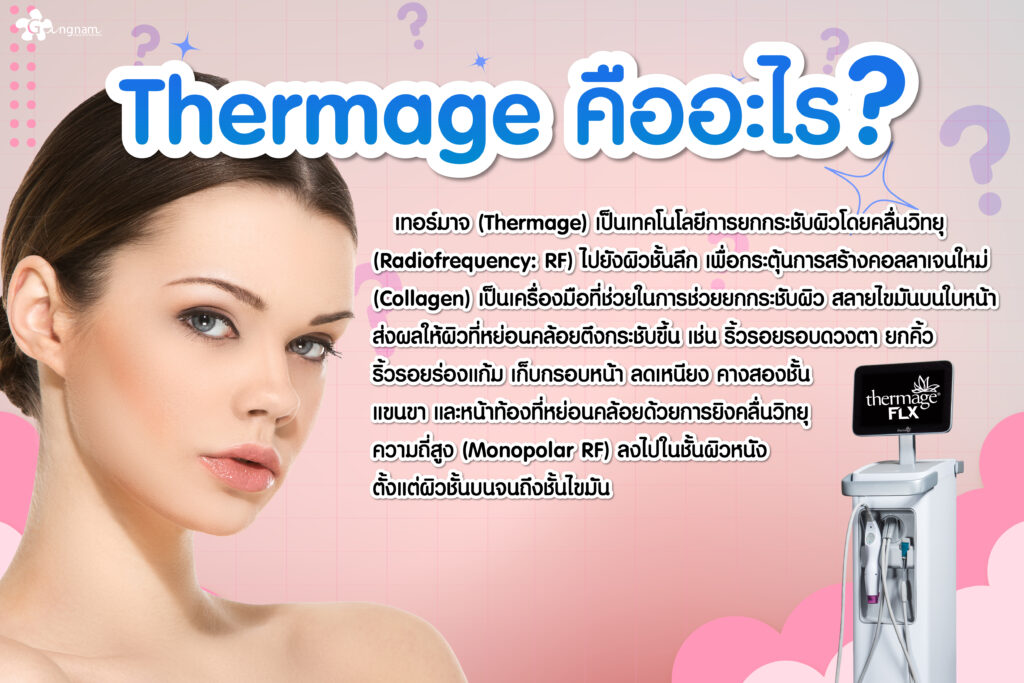 ก่อนที่จะไปทำความรู้จักกับ Thermage FLX เราควรที่จะทำความเข้าใจเทคโนโลยีที่เรียกว่าเทอร์มาจ (Thermage) กันก่อน โดย เทอร์มาจ (Thermage) เป็นเทคโนโลยีการยกกระชับผิวโดยคลื่นวิทยุ (Radiofrequency: RF) ไปยังผิวชั้นลึก เพื่อกระตุ้นการสร้างคอลลาเจนใหม่ (Collagen) เป็นเครื่องมือที่ช่วยในการช่วยยกกระชับผิว สลายไขมันบนใบหน้า ส่งผลให้ผิวที่หย่อนคล้อยตึงกระชับขึ้น เช่น ริ้วรอยรอบดวงตา ยกคิ้ว ริ้วรอยร่องแก้ม เก็บกรอบหน้า ลดเหนียง คางสองชั้น แขนขา และหน้าท้องที่หย่อนคล้อยด้วยการยิงคลื่นวิทยุความถี่สูง (Monopolar RF) ลงไปในชั้นผิวหนัง ตั้งแต่ผิวชั้นบนจนถึงชั้นไขมัน โดยความร้อนจะไปทำให้ผิวเกิดการหดตัว ลดเนื้อไขมัน และกระตุ้นการสร้างคอลลาเจนที่เสื่อมสภาพขึ้นมาใหม่ ทำให้ผิวแน่นกระชับขึ้นได้ในระยะยาว